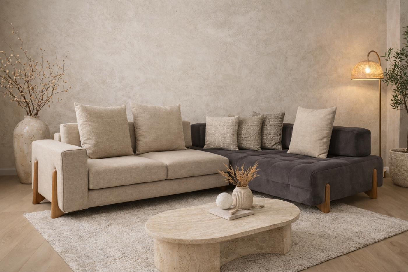 Ο γωνιακός καναπές Terra Forma αποτυπώνει τη φιλοσοφία του Organic Modern μέσα από φυσικές υφές, γήινες αποχρώσεις και διακριτικές ξύλινες λεπτομέρειες.