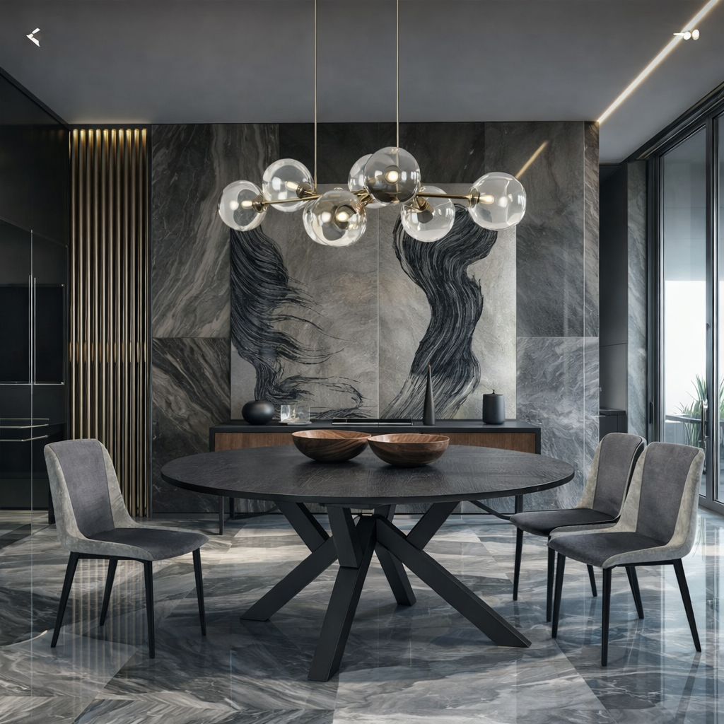 Η τραπεζαρία Orion Round σε συνδυασμό με την καρέκλα Rebecca δημιουργεί ένα σύγχρονο σύνολο με έντονη αρχιτεκτονική ταυτότητα.