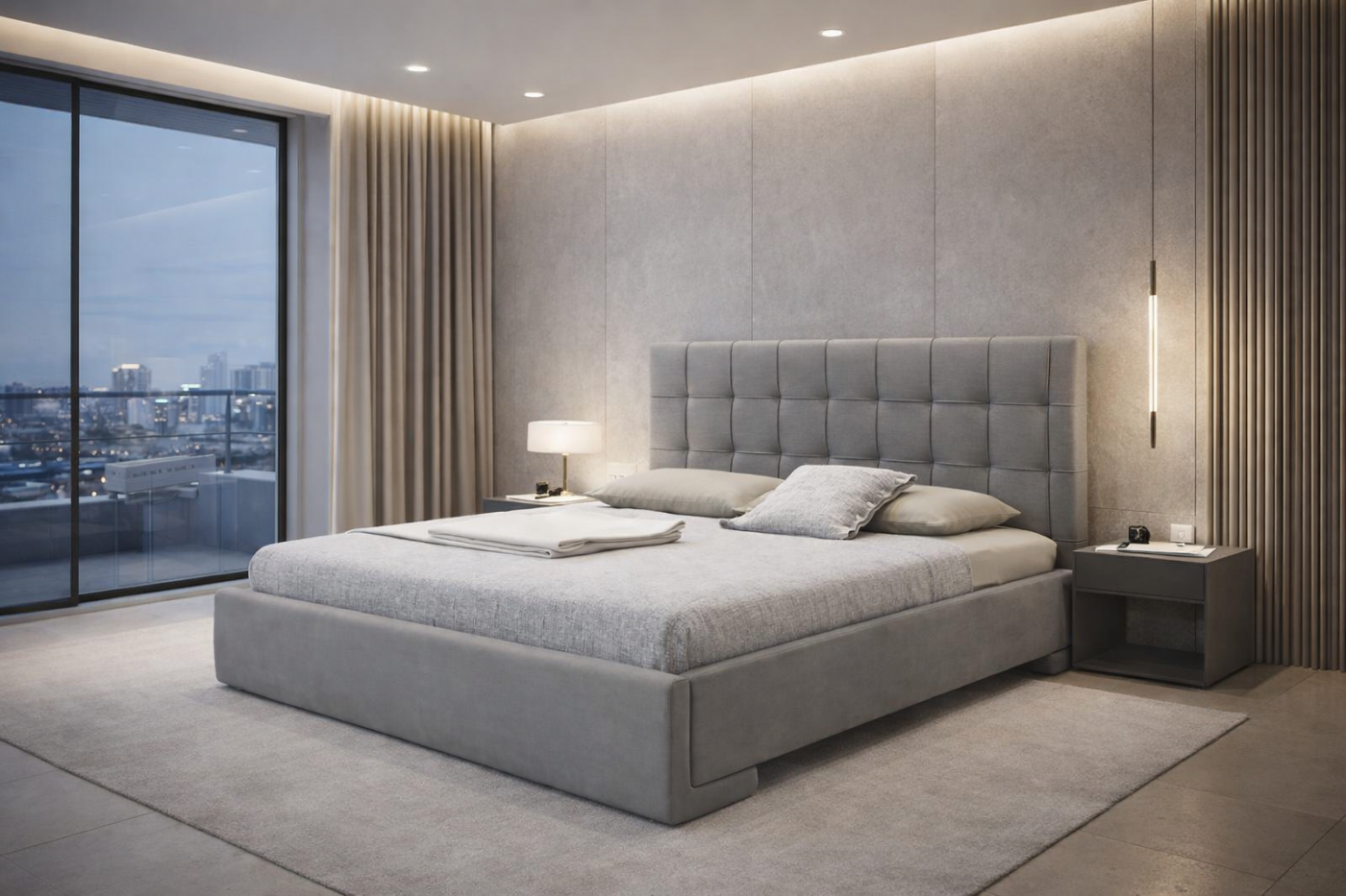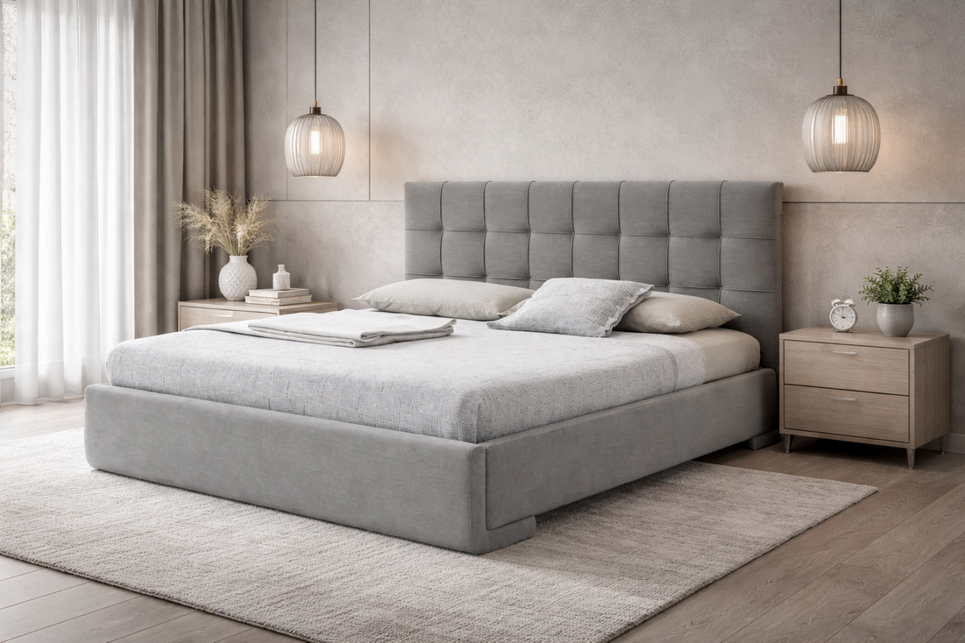 Συνδυάζει μοντέρνα αισθητική, minimal πολυτέλεια και άνεση υψηλού επιπέδου. Ο σχεδιασμός του με επενδυμένο καπιτονέ κεφαλάρι και καθαρές γραμμές δημιουργεί μια αίσθηση σύγχρονης κομψότητας, ιδανική για minimal αλλά luxury υπνοδωμάτια σε φυσικούς και γκρι τόνους.