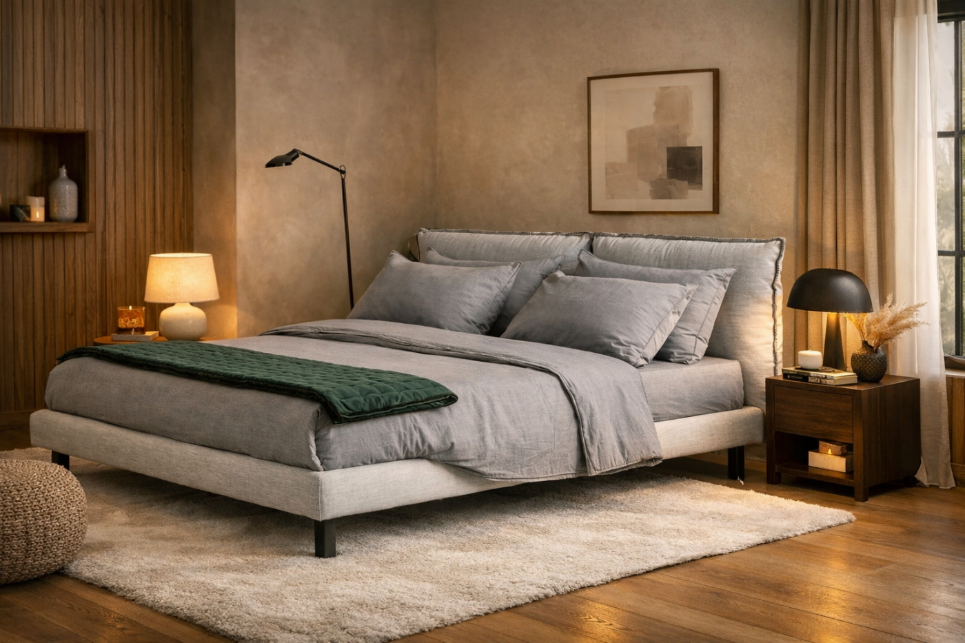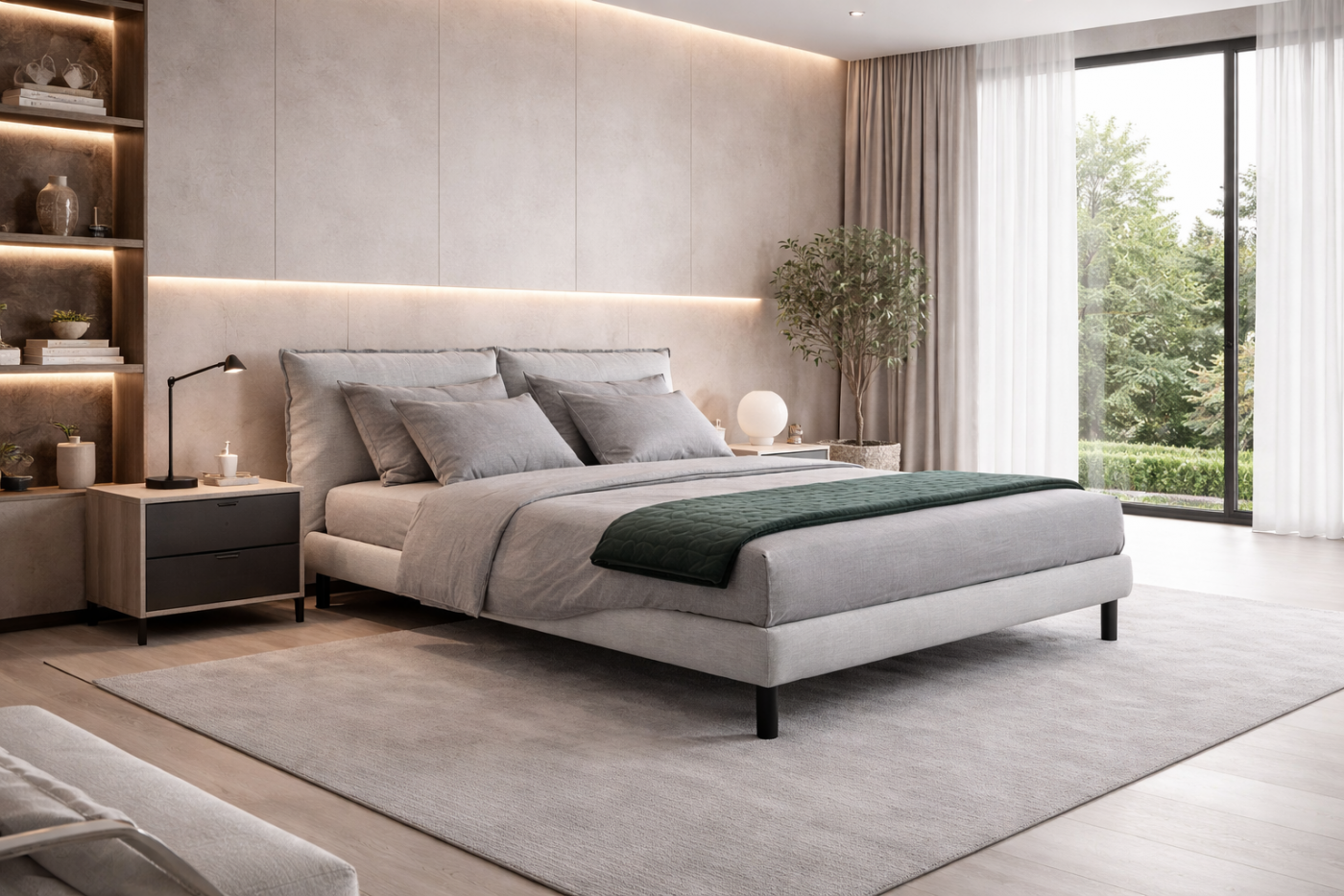 Περιγραφή Προϊόντος Υφασμάτινο κρεβάτι σύγχρονου minimal σχεδιασμού με luxury αισθητική, ιδανικό για μοντέρνα υπνοδωμάτια υψηλών προδιαγραφών. Ο χαμηλός όγκος, τα λεπτά μεταλλικά πόδια και το πλήρως επενδυμένο κεφαλάρι δημιουργούν ένα κομψό και ανάλαφρο αποτέλεσμα, προσφέροντας παράλληλα υψηλό επίπεδο άνεσης και εργονομίας. Η καθαρή γεωμετρία και οι ουδέτερες αποχρώσεις το καθιστούν ιδανική βάση για sophisticated interior styling. Τεχνικά Χαρακτηριστικά Γενικά Τύπος: Διπλό κρεβάτι Σχεδιασμός: Modern / Minimal / Luxury Κατασκευή: Πλήρως επενδυμένο Διαστάσεις (ενδεικτικές) Διατίθεται σε όλες τις βασικές διαστάσεις στρώματος: 160 x 200 cm (Queen) 180 x 200 cm (King) 200 x 200 cm (Super King) Εξωτερικές διαστάσεις: περίπου 10–15 cm περιμετρικά από τη διάσταση στρώματος. (Δυνατότητα ειδικών διαστάσεων κατόπιν παραγγελίας) Κατασκευή Σκελετός: Μασίφ ξύλο & κόντρα πλακέ υψηλής αντοχής Βάση: Ενισχυμένη μεταλλική κατασκευή ή ξύλινο πλαίσιο Στήριξη στρώματος: Τάβλες (ξύλινες) ή μεταλλικό τελάρο Πόδια: Μεταλλικά, μαύρης απόχρωσης, ύψους ~15 cm Κεφαλάρι Πλήρως επενδυμένο Μαλακή αφρώδης επένδυση Σχεδιασμός με διακριτικό όγκο για άνετη στήριξη πλάτης Επένδυση Ύφασμα: Υψηλής ποιότητας, ανθεκτικό στην τριβή Αίσθηση: Μαλακή υφή, premium φινίρισμα Συντήρηση: Καθαρίζεται εύκολα Χρώματα: Διαθέσιμο σε μεγάλη ποικιλία αποχρώσεων & υφασμάτων