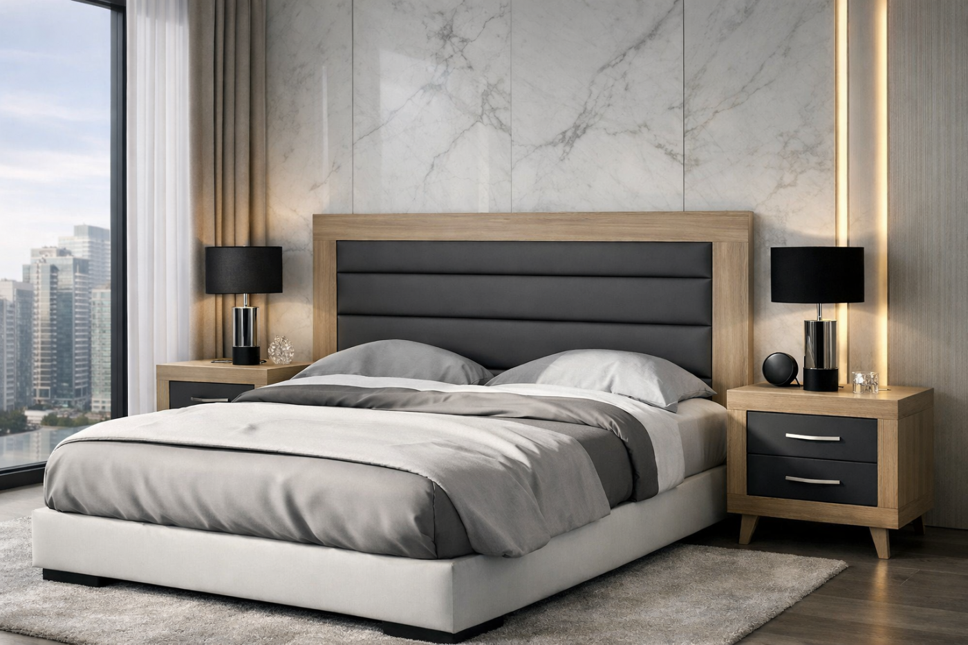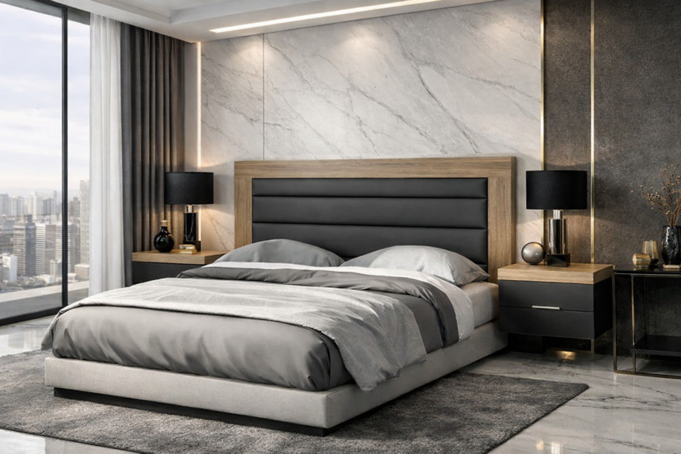 Η συνολική αισθητική: καθαρές γραμμές, ουδέτερη παλέτα χρωμάτων (γκρι, μπεζ, ανθρακί) και υλικά υψηλής ποιότητας που αποπνέουν ηρεμία και κύρος. Το κρεβάτι λειτουργεί ως κεντρικό στοιχείο του χώρου, χωρίς υπερβολές, αλλά με έντονη παρουσία.