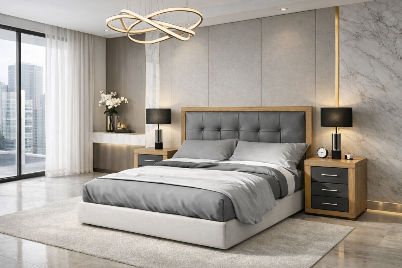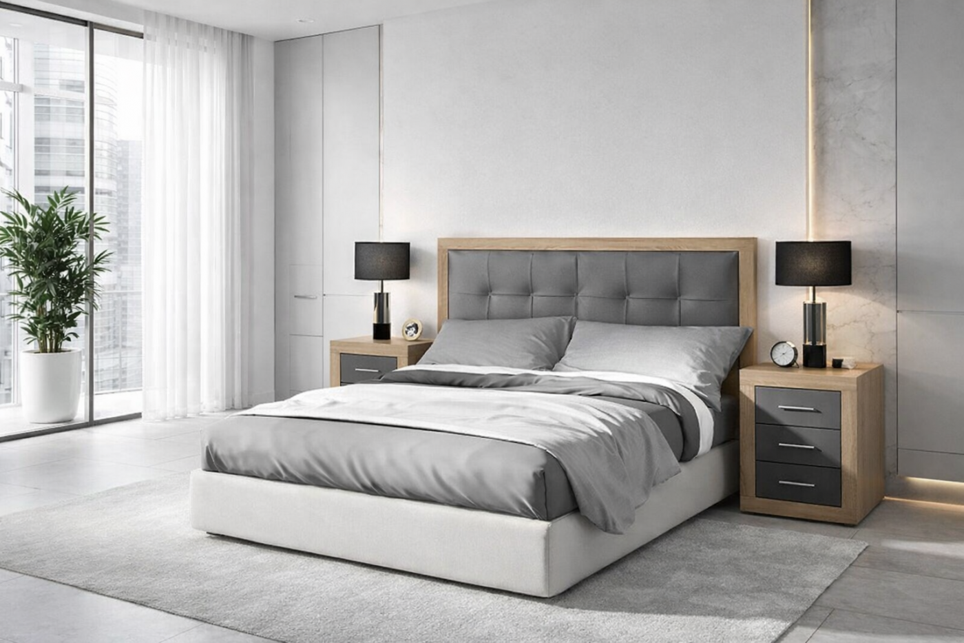 Ο χώρος αποτυπώνει ένα σύγχρονο υπνοδωμάτιο υψηλής αισθητικής, όπου ο minimal σχεδιασμός συνδυάζεται με luxury λεπτομέρειες. Το κρεβάτι λειτουργεί ως το κεντρικό στοιχείο της σύνθεσης, με επενδεδυμένο, καπιτονέ κεφαλάρι σε γκρι ύφασμα και πλαίσιο από φυσικό δρυ, προσδίδοντας αίσθηση ζεστασιάς και διαχρονικής κομψότητας.