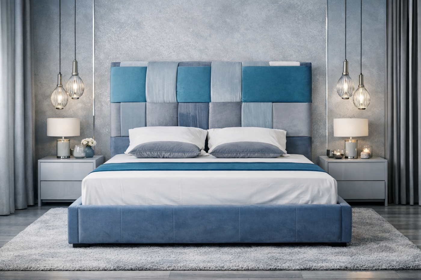 Το συγκεκριμένο κρεβάτι αποτελεί μια σύγχρονη πρόταση υψηλής αισθητικής, συνδυάζοντας μοντέρνο design με αίσθηση πολυτέλειας και άνεσης. Το εντυπωσιακό καπιτονέ κεφαλάρι σε αποχρώσεις πετρόλ, γαλάζιου και ασημί δημιουργεί ένα δυναμικό αλλά ταυτόχρονα ήρεμο οπτικό αποτέλεσμα, ιδανικό για σύγχρονους minimal αλλά και luxury χώρους.
