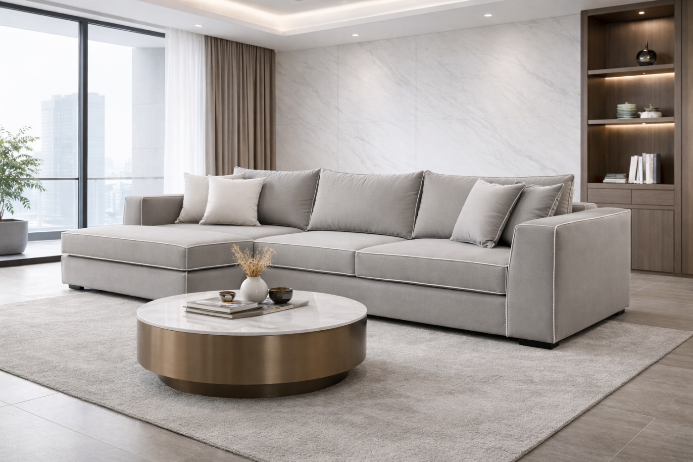 Ο γωνιακός καναπές Best εκφράζει τη σύγχρονη πολυτέλεια μέσα από καθαρές γεωμετρικές γραμμές και έντονες λευκές ραφές που αναδεικνύουν το σχήμα του.