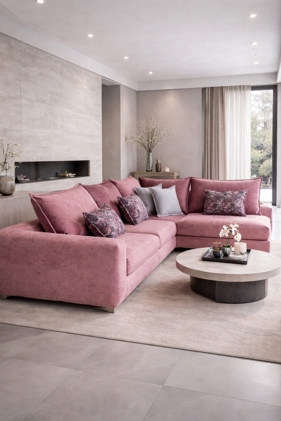 Η σχεδίασή του εξασφαλίζει άνεση καθημερινής χρήσης, χωρίς να θυσιάζεται η αισθητική, ενώ τα διακοσμητικά μαξιλάρια σε ουδέτερους και υφασμάτινους τόνους ενισχύουν τον χαρακτήρα του luxury minimal. Τεχνικά Χαρακτηριστικά Τύπος: Γωνιακός καναπές (L-shape) Επένδυση: Υψηλής ποιότητας βελούδινο ύφασμα (velvet) Χρώμα: Dusty pink / σάπιο μήλο Σκελετός: Ενισχυμένος ξύλινος σκελετός από μασίφ ξυλεία & MDF Μαξιλάρια: Περιλαμβάνονται, αποσπώμενα Ιδανικός για: Μοντέρνα και minimal σαλόνια Χώρους με luxury αισθητική Interior design projects υψηλών απαιτήσεων