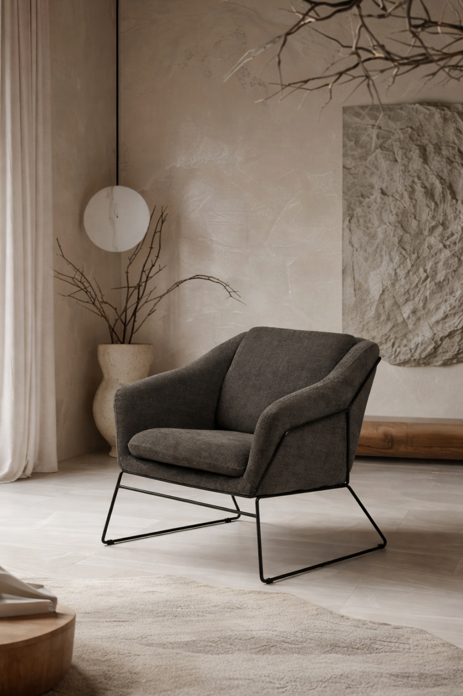 Η σκούρα υφασμάτινη υφή σε συνδυασμό με τη λεπτή μεταλλική βάση δημιουργούν ένα διακριτικό contrast που αναδεικνύει τον χαρακτήρα της. Πρόκειται για ένα κομμάτι που ενσωματώνεται αρμονικά σε σύγχρονους χώρους, είτε πρόκειται για κατοικία είτε για premium επαγγελματικό περιβάλλον.