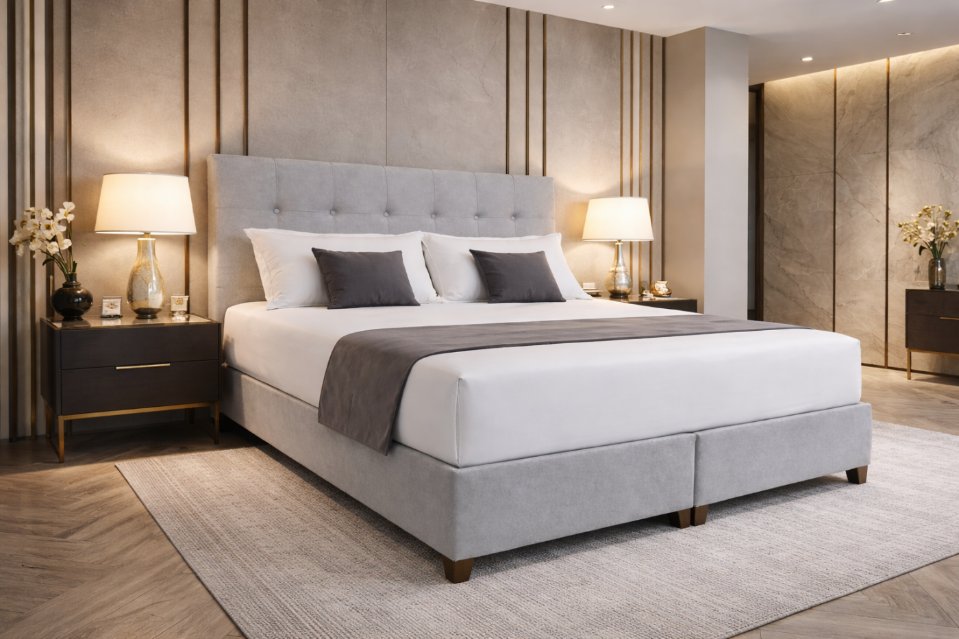 Το κρεβάτι μπορεί να συνδυαστεί με ανατομικό στρώμα προηγμένης τεχνολογίας, που προσαρμόζεται στο σώμα και εξασφαλίζει σωστή στήριξη της σπονδυλικής στήλης, προσφέροντας ξεκούραστο και ποιοτικό ύπνο.(Δεν συμπεριλαμβάνεται στην τιμή). Τεχνικά Χαρακτηριστικά Κρεβάτι Τύπος: Διπλό κρεβάτι box Σκελετός: Ενισχυμένη κατασκευή από μασίφ ξύλο & MDF Επένδυση: Υψηλής ποιότητας ύφασμα easy clean Προσκέφαλο: Καπιτονέ, επενδυμένο με αφρώδες υλικό υψηλής πυκνότητας Πόδια: Ξύλινα, φυσική απόχρωση Χρώμα: Ανοιχτό γκρι (custom επιλογές κατόπιν παραγγελίας) Διαστάσεις (ενδεικτικά) 160 x 200 cm 180 x 200 cm Δυνατότητα ειδικών διαστάσεων κατόπιν παραγγελίας Συνδυάζει design, εργονομία και premium υλικά, αποτελώντας μια επένδυση άνεσης και αισθητικής για πολλά χρόνια.