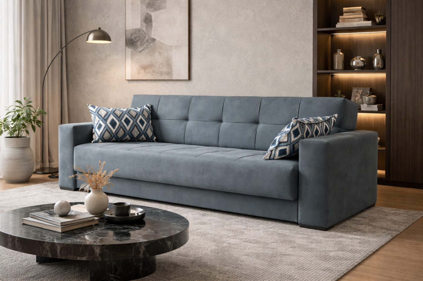 Ο μηχανισμός ανοίγει ομαλά χωρίς περίπλοκες κινήσεις, διατηρώντας την αισθητική του καναπέ αναλλοίωτη. Ιδανικός για σύγχρονα διαμερίσματα, studio, Airbnb ή χώρους που απαιτούν έξυπνες λύσεις χωρίς συμβιβασμούς στο design.
