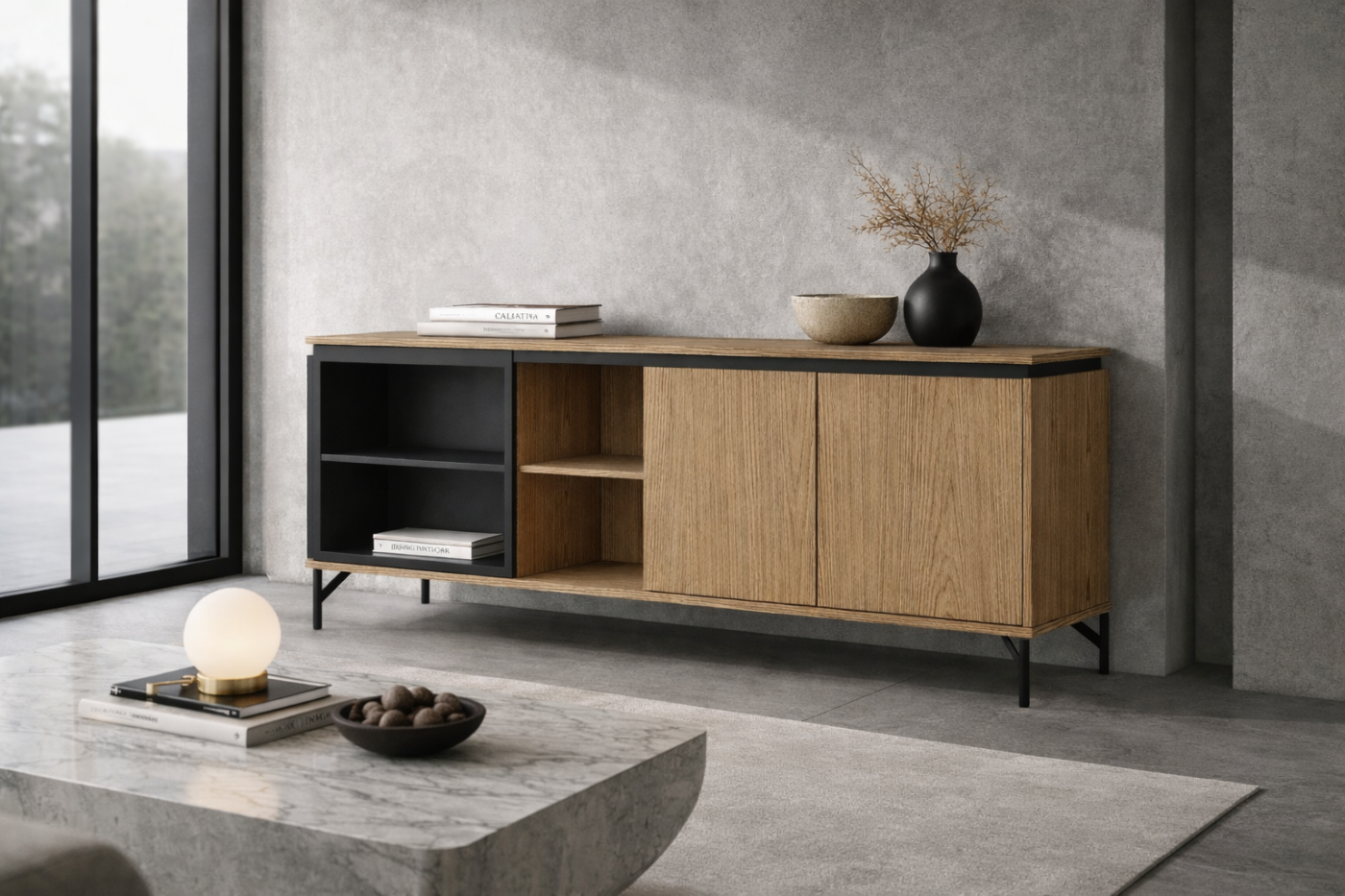 Ο μπουφές Axis εκφράζει την ουσία του σύγχρονου αρχιτεκτονικού design, συνδυάζοντας καθαρές οριζόντιες γραμμές με έντονες γεωμετρικές αντιθέσεις. Η ισορροπία μεταξύ της φυσικής υφής του ξύλου και της μαύρης ματ επιφάνειας δημιουργεί ένα δυναμικό αλλά απόλυτα εκλεπτυσμένο αποτέλεσμα.