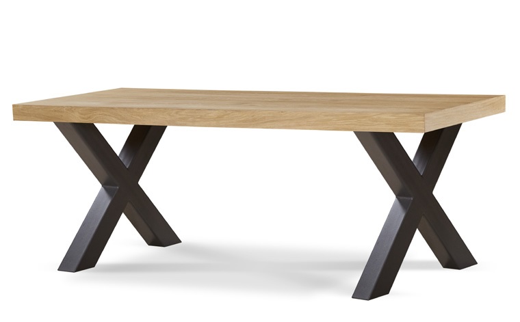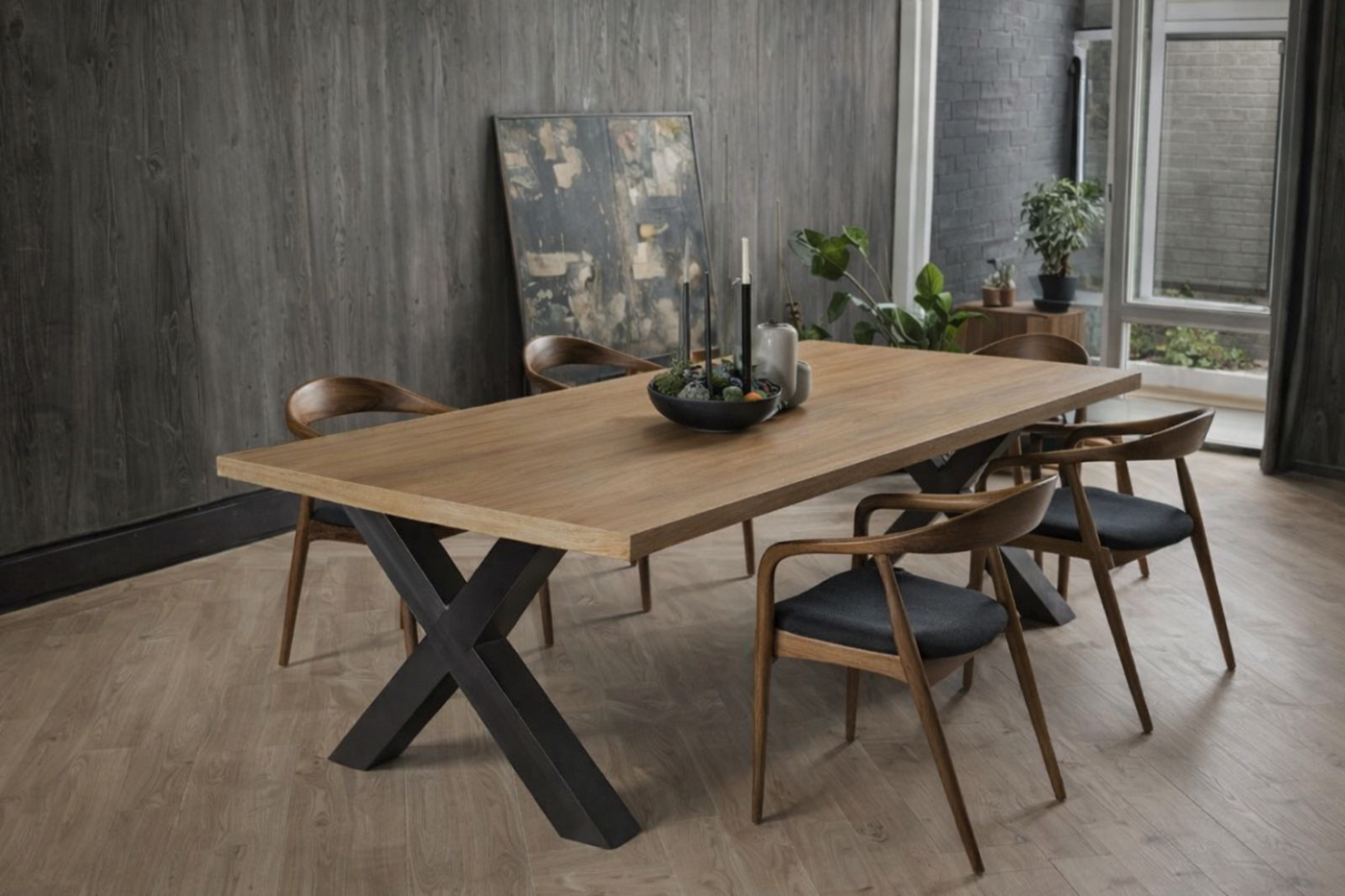 Η τραπεζαρία Dominus αποπνέει δύναμη και ισορροπία μέσα από τη γεωμετρική της καθαρότητα. Το στιβαρό, ορθογώνιο καπάκι με καθαρές 90° γωνίες αναδεικνύει τη φυσική υφή του ξύλου, ενώ η μεταλλική βάση τύπου Χ προσδίδει αρχιτεκτονικό χαρακτήρα και απόλυτη σταθερότητα.