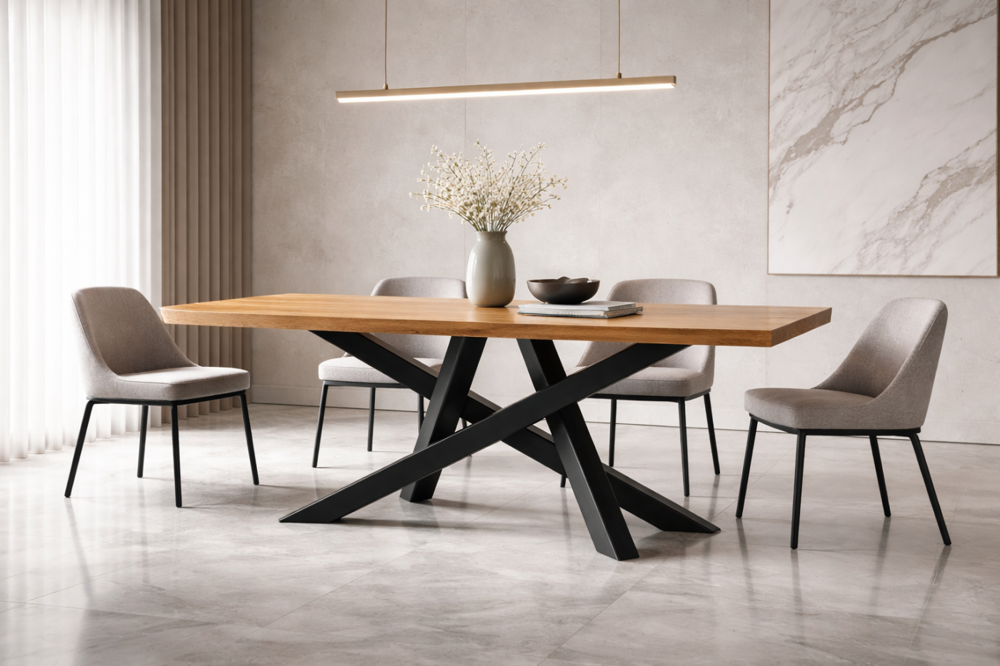 Η φυσική ξύλινη επιφάνεια προσθέτει ζεστασιά και διαχρονικότητα, δημιουργώντας μια ιδανική ισορροπία ανάμεσα στο minimal και το luxury αισθητικό αποτέλεσμα. Είναι ιδανική επιλογή για μοντέρνους χώρους τραπεζαρίας, open-plan καθιστικά ή επαγγελματικούς χώρους υψηλής αισθητικής.