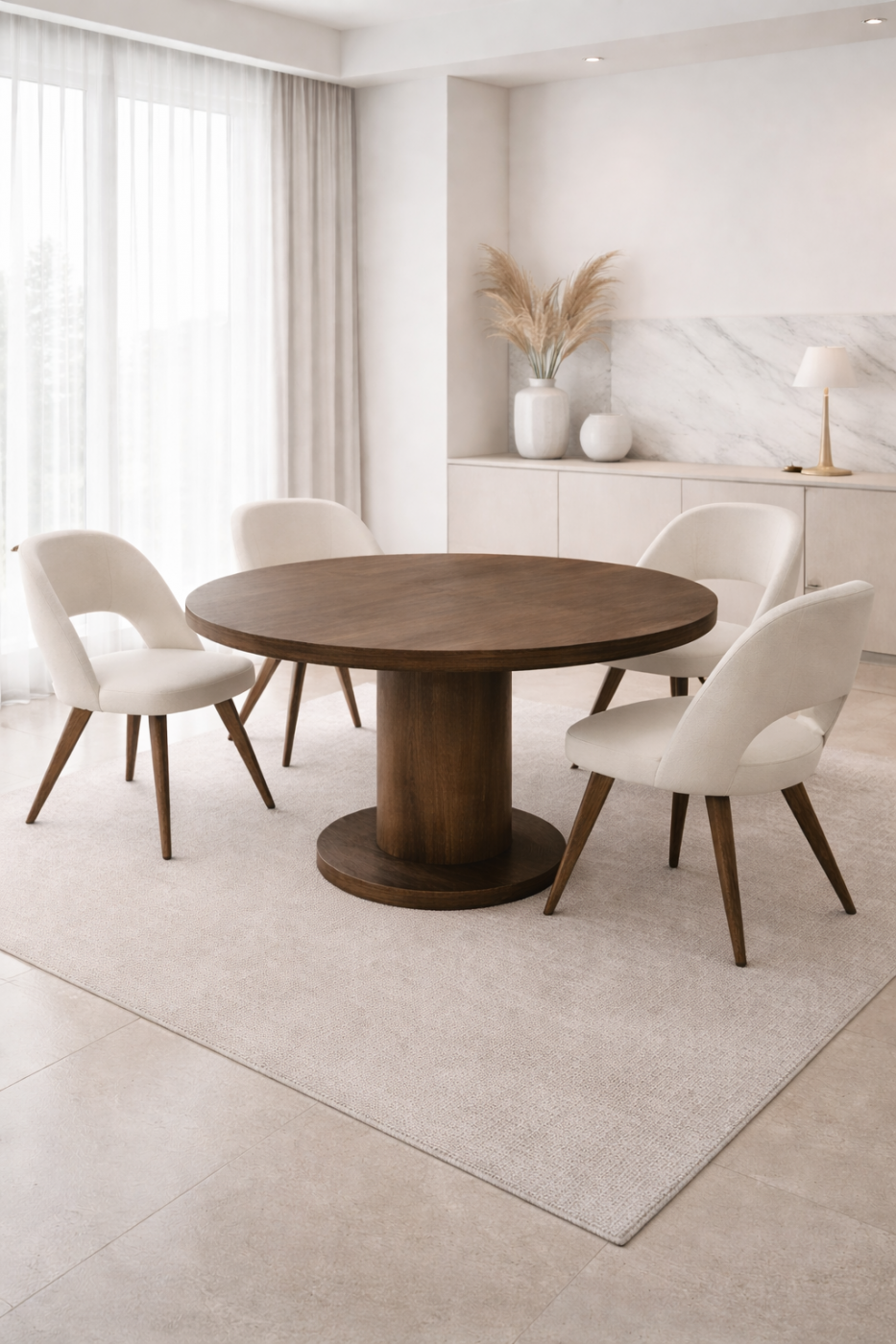 Περιγραφή Η τραπεζαρία Selina αποτελεί την απόλυτη έκφραση σύγχρονης κομψότητας. Ο στρογγυλός σχεδιασμός της δημιουργεί μια αίσθηση αρμονίας και ζεστασιάς στον χώρο, ενώ η επιβλητική κεντρική βάση τύπου pedestal προσφέρει σταθερότητα και άνεση στην τοποθέτηση καθισμάτων.