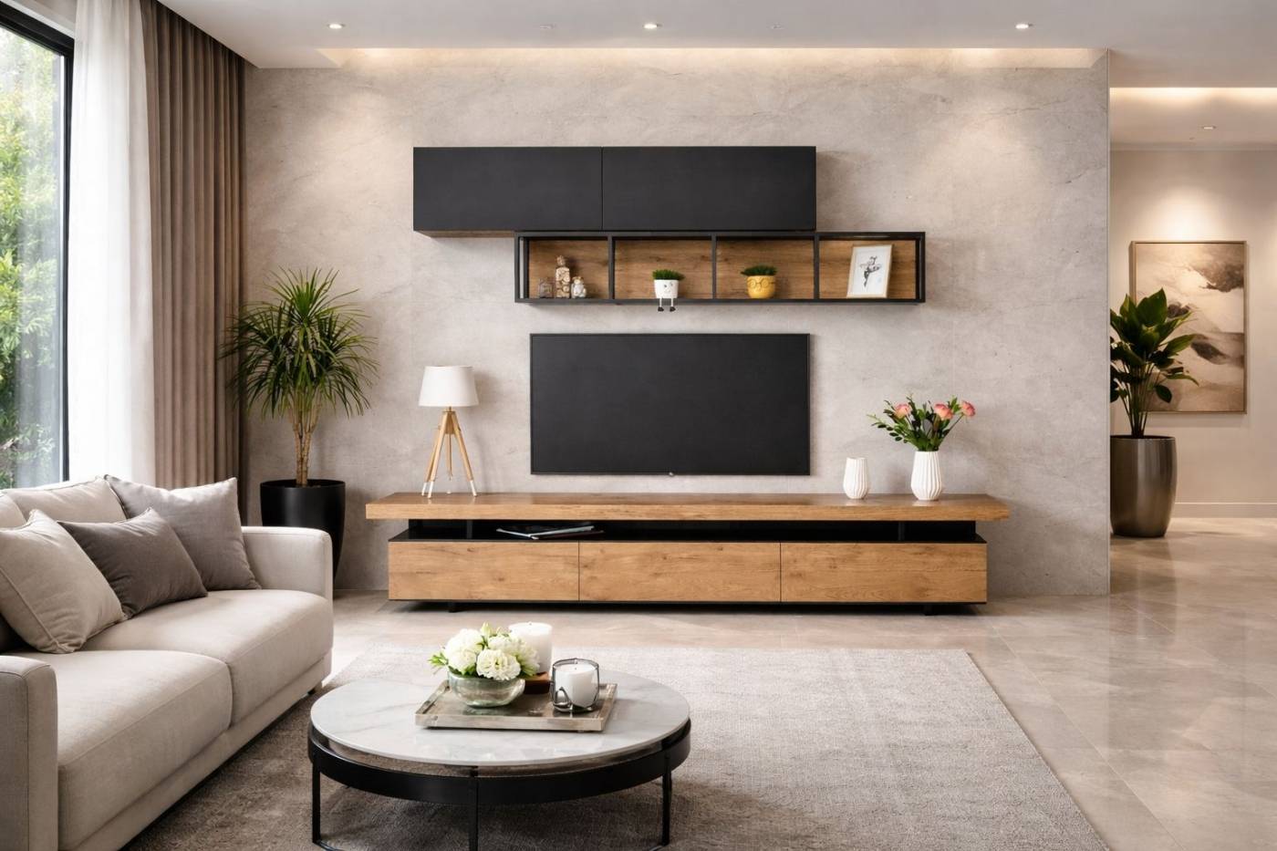 Η σύνθεση τηλεόρασης Signature αποτελεί μία αρχιτεκτονική πρόταση υψηλής αισθητικής, σχεδιασμένη για χώρους που απαιτούν απόλυτη καθαρότητα γραμμών και διαχρονική πολυτέλεια. Ο συνδυασμός φυσικού ξύλου και ματ μαύρων επιφανειών δημιουργεί ένα εκλεπτυσμένο, ισορροπημένο αποτέλεσμα που ενσωματώνεται αρμονικά σε σύγχρονα luxury interiors.