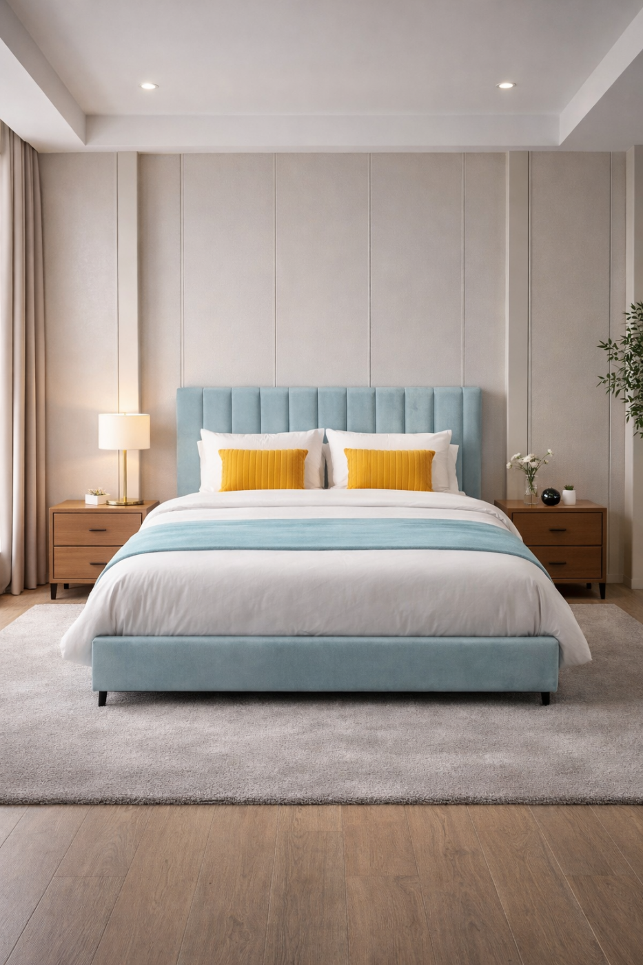 Το AZURE συνδυάζεται άψογα με ουδέτερες αποχρώσεις, φυσικά υλικά και σύγχρονο φωτισμό, δημιουργώντας ένα υπνοδωμάτιο που ισορροπεί ανάμεσα στη λειτουργικότητα και την αισθητική πολυτέλεια.