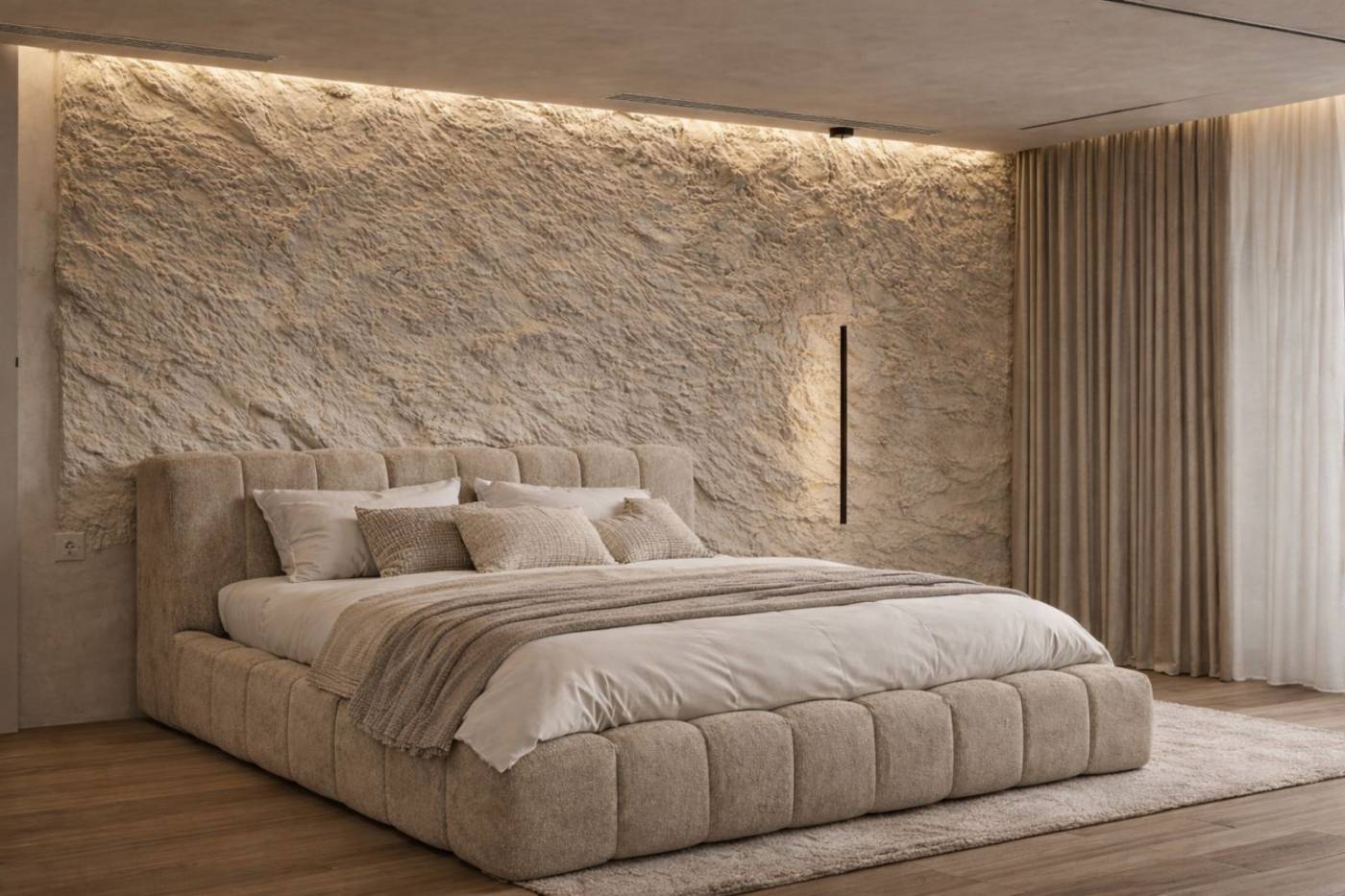 Η αφράτη υφή bouclé σε ζεστή μπεζ απόχρωση αγκαλιάζει τον χώρο, δημιουργώντας ένα ήρεμο, premium αποτέλεσμα. Ιδανική επιλογή για minimal luxury υπνοδωμάτια με φυσικά υλικά, microcement ή stone-effect τοίχους.